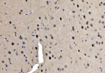 Immunohistochemistry: Paraffin-embedded Mouse brain tissue. Antigen Retrieval: Heat mediation was performed in EDTA buffer (pH 8.0). The tissue section was blocked with 10% goat serum. The tissue section was then stained with ARG43746 anti-SRF antibody at 2 µg/ml dilution, overnight at 4°C.