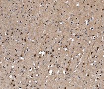 Immunohistochemistry: Paraffin-embedded Rat brain tissue. Antigen Retrieval: Heat mediation was performed in EDTA buffer (pH 8.0). The tissue section was blocked with 10% goat serum. The tissue section was then stained with ARG43746 anti-SRF antibody at 2 µg/ml dilution, overnight at 4°C.