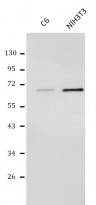 Western blot: NIH3T3 and C6 cell lysates stained with ARG43746 anti-SRF antibody at 0.5 ug/mL dilution.