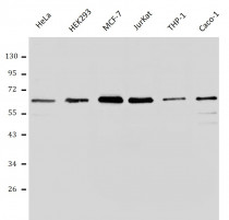Western blot: HeLa, HEK293, MCF-7, JurKat, THP-1 and Caco-1 cell lysates stained with ARG43746 anti-SRF antibody at 0.5 ug/mL dilution.