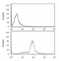 Flow Cytometry: HeLa cells stained with ARG40132 anti-SRP72 antibody (bottom histogram) or without primary antibody as control (top histogram), followed by incubation with FITC labelled secondary antibody.