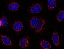 Immunofluorescence: methanol-acetone fixed HeLa cells stained with ARG63104 anti-STIM1 antibody [CDN3H4] followed by incubation with Goat anti-mouse IgG1 Alexa Fluor® 598 (red)