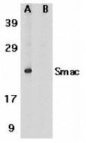Western blot: A: Human heart tissue lysate in the absence of blocking peptide; B: Human heart tissue lysate in the presence of blocking peptid stained with ARG54330 anti-Smac / Diablo antibody at 1 μg/ml dilution.