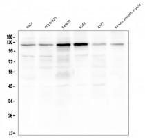 Western blot: 50 µg of samples under reducing conditions. HeLa, COLO-320, SW620, K562, A375 and Mouse smooth muscle lysates stained with ARG59311 anti-Smoothelin antibody at 0.5 µg/ml, overnight at 4°C.