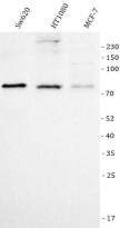 Western blot: Sw620, HT1080, and MCF-7 stained with ARG45216 anti-SnoN / SNO antibody at 0.5 μg/ml dilution.