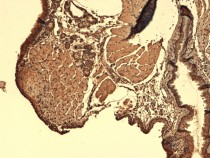 Immunohistochemistry: 10% Formalin (12-24 hours at RT) fixed Mouse Trachea stained with ARG22286 anti-Sodium Iodide Symporter antibody [FP5] (brown) at 1:1000 dilution (1 hour). Counterstain: Mayer Hematoxylin (purple/blue) nuclear stain at 250-500uL for 5 minutes at RT.