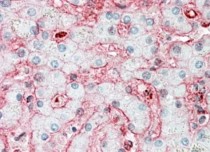 Immunohistochemistry: paraffin-embedded Human Liver stained with ARG65739 anti-Stomatin antibody at 5 µg/ml dilution. Steamed antigen retrieval with citrate buffer pH 6, AP-staining.
