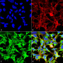 Immunofluorescence: 5% Formaldehyde fixed (5 min) HEK293 cells stained with ARG22638 anti-Sulfotyrosine antibody [7C5] at 1:50 for 30 - 60 min at RT. Secondary Antibody: Goat anti-Mouse (Alexa Fluor 488) at 1:1500 for 30 - 60 min at RT. Counterstain: Phalloidin Alexa Fluor 633 F-Actin stain; DAPI (blue) nuclear stain. (A) DAPI (blue) nuclear stain. (B) Phalloidin Alex Fluor 633 F-Actin stain. (C) Primary antibody (D) Composite. .