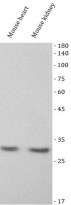 ARG45291 anti-Surf1 antibody WB image Western blot: Mouse heart and mouse kidney stained with ARG45291 anti-Surf1 antibody at 0.5 μg/ml dilution.