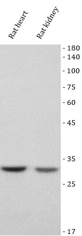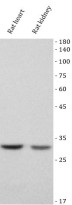 ARG45291 anti-Surf1 antibody WB image Western blot: Rat heart and rat kidney stained with ARG45291 anti-Surf1 antibody at 0.5 μg/ml dilution.