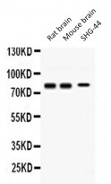 Western blot: Rat brain, Mouse brain and SHG-44 lysates stained with ARG59113 anti-Synapsin 1 antibody at 0.5 µg/ml dilution.