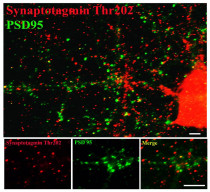 Immunohistochemistry: 14 DIV Rat cortical neurons showing synaptotagmin when phosphorylated at Thr202 stained with ARG52437 anti-Synaptotagmin phospho (Thr202) antibody in red and PSD95 in green.