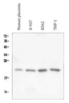Western blot: 50 µg of samples under reducing conditions. Human placenta, U-937, K562 and THP-1 whole cell lysates stained with ARG41574 anti-TAF12 antibody at 0.5 µg/ml dilution, overnight at 4°C.