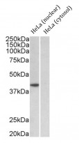 Western blot: 35 µg of HeLa (nuclear) and HeLa (cytosol) lysates (in RIPA buffer) stained with ARG41600 anti-TBP / TATA Binding Protein antibody at 1 µg/ml dilution and incubated at RT for 1 hour.