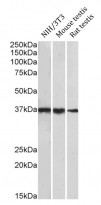 Western blot: 35 µg of NIH/3T3, Mouse testis and Rat testis lysates (in RIPA buffer) stained with ARG41600 anti-TBP / TATA Binding Protein antibody at 1 µg/ml dilution and incubated at RT for 1 hour.