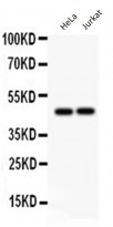 Western blot: 40 µg of HeLa and Jurkat cell lysates stained with ARG59035 anti-TCPTP antibody at 0.5 µg/ml dilution.