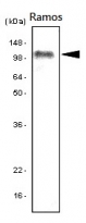 Western blot: 80 µg of Ramos cell lysates stained with ARG56919 anti-TLR7 antibody [4F4] at 1:1000. Arrow indicates TLR7 protein in Human Ramos cells.