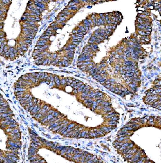 Immunohistochemistry: Human colorectal adenocarcinoma stained with ARG45253 anti-TMC7 antibody at 2 μg/ml dilution.