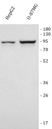 Western blot: HepG2 and U-87MG stained with ARG45253 anti-TMC7 antibody at 0.5 μg/ml dilution.