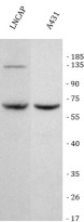 Western blot: LNCAP and A431 stained with ARG45254 anti-TMPRSS13 antibody at 0.5 μg/ml dilution.