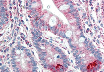 Immunohistochemistry: Paraffin-embedded Human small intestine tissue. Antigen Retrieval: Steam tissue section in Citrate buffer (pH 6.0). The tissue section was stained with ARG63174 anti-TMPRSS5 / Spinesin antibody at 5 µg/ml dilution followed by AP-staining.