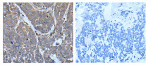Immunohistochemistry: Paraffin-embedded Human thyroid cancer tissue stained with ARG43595 anti-TNMD / Tenomodulin antibody (left) at 1:40 dilution, or the same antibody pre-incubated with immunogen (right). (Original magnification: X200).