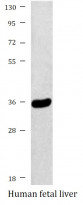 Western blot: Human fetal liver lysate stained with ARG43595 anti-TNMD / Tenomodulin antibody.
