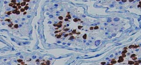 Immunohistochemistry: Human testis stained with ARG44757 anti-TRAFD1 antibody at 2.5 µg/mL dilution.
