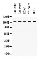 Western blot: 50 µg of Rat testis, 50 µg of Rat ovary, 40 µg of SKOV, 40 µg of COLO320 and 40 µg of HeLa whole cell lysates stained with ARG40934 anti-TRIM28 / KAP1 antibody at 0.5 µg/ml dilution.