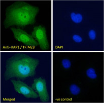 Immunofluorescence: Paraformaldehyde fixed HeLa cells permeabilized with 0.15% Triton. Cells were stained with ARG63250 anti-TRIM28 / KAP1 antibody (green) at 10 µg/ml dilution for 1 hour. DAPI (blue) for nuclear staining. Negative control: Unimmunized goat IgG (green) at 10 µg/ml dilution.