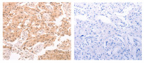 Immunohistochemistry: Paraffin-embedded Human ovarian cancer tissue stained with ARG65598 anti-TRPC3 antibody (left) at 1:80 dilution, or the same antibody preincubated with synthetic peptide (right). (Original magnification: ×200).