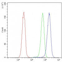 Flow Cytometry: HeLa cells were blocked with 10% normal goat serum and then stained with ARG59102 anti-TUB / Tubby protein homolog antibody (blue) at 1 µg/10^6 cells for 30 min at 20°C, followed by incubation with DyLight®488 labelled secondary antibody. Isotype control antibody (green) was rabbit IgG (1 µg/10^6 cells) used under the same conditions. Unlabelled sample (red) was also used as a control.