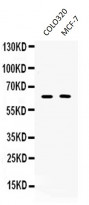 Western blot: COLO320 and MCF-7 cell lysates stained with ARG59102 anti-TUB / Tubby protein homolog antibody at 0.5 µg/ml dilution.
