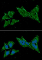 Immunofluorescence: HeLa cells line stained with ARG57169 anti-TXN2 / Thioredoxin 2 antibody [1B1] at 1:100 (Green).
