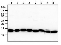 Western blot: 40 µg of 1) HepG2, 2) HeLa, 3) Raji, 4) K562, 5) Jurkat, 6) A431, 7) MCF7, and 8) THP1 cell lysates stained with ARG57169 anti-TXN2 / Thioredoxin 2 antibody [1B1] at 1:1000.