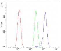 Flow Cytometry: THP-1 cells were blocked with 10% normal goat serum and then stained with ARG43065 anti-TXNIP antibody (blue) at 1 µg/10^6 cells for 30 min at 20°C, followed by incubation with DyLight®488 labelled secondary antibody. Isotype control antibody (green) was rabbit IgG (1 µg/10^6 cells) used under the same conditions. Unlabelled sample (red) was also used as a control.
