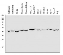Western blot: 50 µg of sample under reducing conditions. Rat brain, Rat kidney, PC-12, Mouse brain, Mouse kidney, NIH/3T3, Raw264.7, K562, HeLa, HEK293, HL-60, A549, Caco-2 and Raji whole cell lysates stained with ARG43065 anti-TXNIP antibody at 0.5 µg/ml dilution, overnight at 4°C.