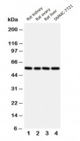 Western blot: Rat kidney, Rat ovary, Rat liver and SMMC-7721 cell lysates stained with ARG58129 anti-TXNRD2 antibody.