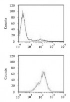 Flow Cytometry: CEM cells stained with ARG55838 anti-Triosephosphate isomerase antibody (bottom histogram) or without primary antibody control (top histogram), followed by incubation with FITC labelled secondary antibody.