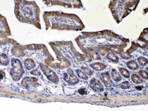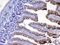 Immunohistochemistry: Paraffin-embedded Mouse small intestine tissue. Antigen Retrieval: Heat mediated was performed in Citrate buffer (pH 6.0, epitope retrieval solution) for 20 min. The tissue section was blocked with 10% goat serum. The tissue section was then stained with ARG59306 anti-UGT1A1 antibody at 1 ug/ml, overnight at 4°C.