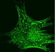 Immunofluorescence: Focal contacts and actin filaments of a Human skin fibroblast stained with ARG10663 anti-VASP antibody.