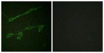 Immunofluorescence: NIH/3T3 cells stained with ARG66850 anti-VAV2 phospho (Tyr142) antibody. The picture on the right is blocked with the phospho peptide.