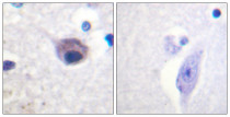 Immunohistochemistry: Paraffin-embedded Human brain tissue stained with ARG66850 anti-VAV2 phospho (Tyr142) antibody. The picture on the right is blocked with the phospho peptide.