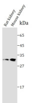 Western blot: Rat kidney and Mouse kidney stained with ARG43822 anti-VDAC1 / Porin antibody at 1:1000 dilution.