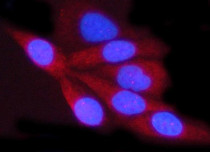 Immunofluorescence: HELA cells stained with ARG44010 anti-VDAC1 / Porin antibody at 5 μg/ml dilution.