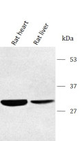 Western blot: Rat heart and Rat liver stained with ARG44010 anti-VDAC1 / Porin antibody at 0.5 μg/mL dilution.