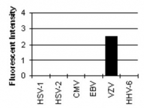 Immunofluorescence: HSV-1, HSV-2, CMV, EBV, VZV, and HHV-6 infected cells stained with ARG22402 anti-VZV IE62 antibody [8B11] at 1:100 dilution.