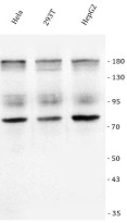 Western blot: Hela, 293T, and HepG2_x000D_ stained with ARG45220 anti-WAPL / FOE antibody at 0.5 μg/ml dilution.