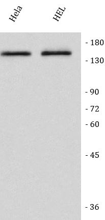 Western blot: Hela and HEL stained with ARG45259 anti-WDR44 antibody at 0.5 μg/ml dilution.