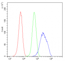 Flow Cytometry: U2OS cells were blocked with 10% normal goat serum and then stained with ARG43038 anti-WWOX antibody (blue) at 1 µg/10^6 cells for 30 min at 20°C, followed by incubation with DyLight®488 labelled secondary antibody. Isotype control antibody (green) was rabbit IgG (1 µg/10^6 cells) used under the same conditions. Unlabelled sample (red) was also used as a control.
